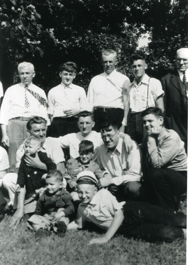 Front sitting or kneeling L to R: Stanley Smolinski, Felix Nowowiejski, Arthur Majewski, Edward Smolinski, Joseph Burval sitting in Edward Halterslap, Eugene Majewski, Vincent Halter, Lucille Smolinski in front of Vincent with head turned, John Halter, Mary Smolinski, Bernice Smolinski in lap of Estelle Smolinski with head turned to rear, Edward Halter, Estelle Smolinski, Christine Halter