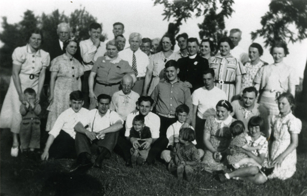 Back Group Standing L to R: Cecilia Halter with David Burval, Julius Smolinski, Pauline Jelinek Halter, Felix Majewski, Victoria Halter Smolinski, Vincent Nowowiejski, Anton Nowowiejski, Walter Smolinski, Ted Novak, Kate Halter Nowowiejski, Anna Lange Halter, Joseph Burval Sr., Fr. Hilary Halter, Emily Halter Majewski, Mamie Halter, Jacob Smolinski, Antonia Halter Smolinski, Grace Poslar Halter