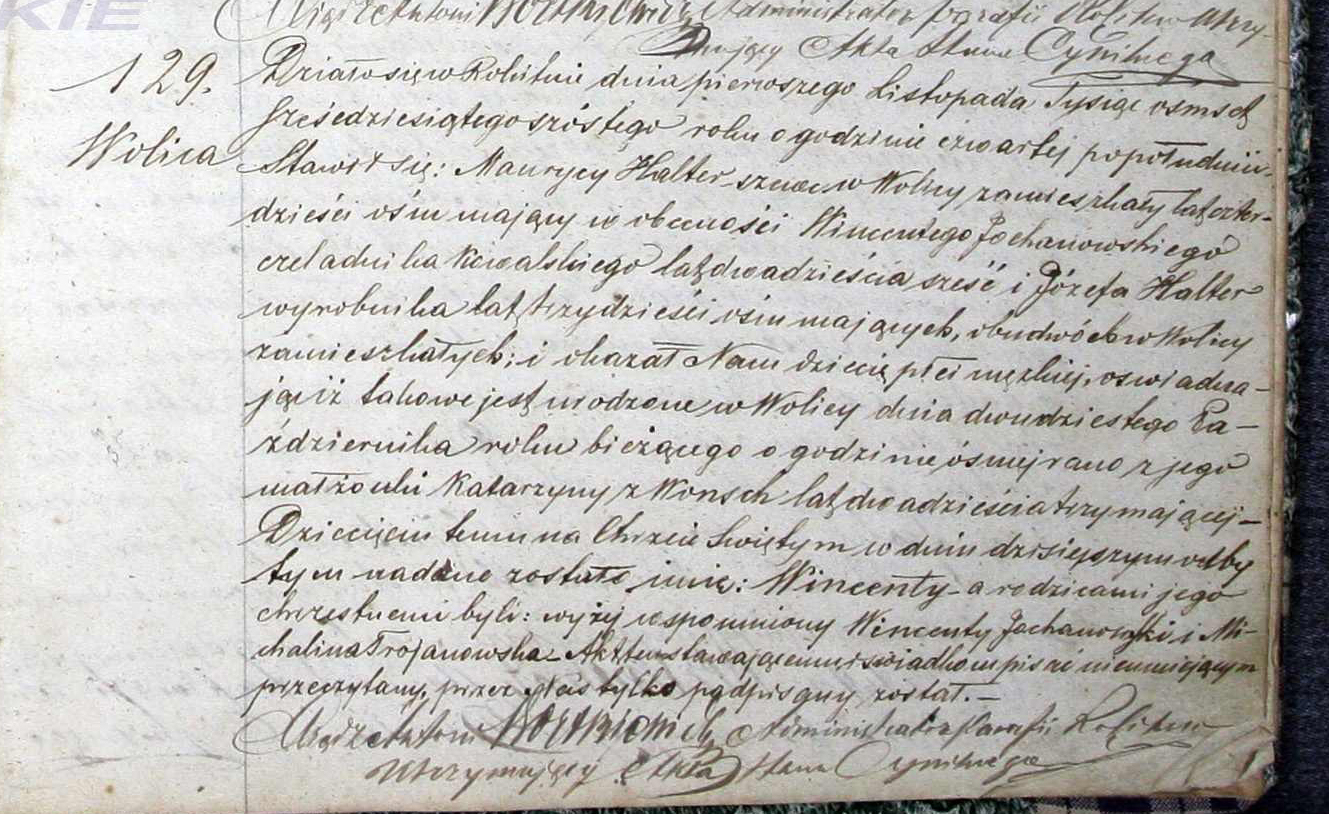It did happen in Rokitno in the first day of November one thousand eight hundred and sixty-six years at four o'clock in the afternoon. Appeared in Maurycy Halter shoemaker residing in Wolica, forty-eight years old, in the presence of Wincenty Jochanowskiego qualified craftsmen blacksmith, twenty-six years old, and Joseph Halter labourer, thirty-eight years old, both residing in Wolica, and presented us a male child, declaring he is born in Wolica, on the twentieth day of October of the current year at eight o'clock in the morning, with his wife, Katarzyna born Wonsch twenty-three years old. On the holy baptism held today the child was given the name Wincenty and his godparents were above mentioned Wincenty Jochanowski and Michalina Trojanowska. This act was read to the present and witnesses who do not know how to write, by us alone has been signed. Priest Antoni Woyt...nicki Administrator of Parish Rokitno, keeping Civil Vital Records Registry