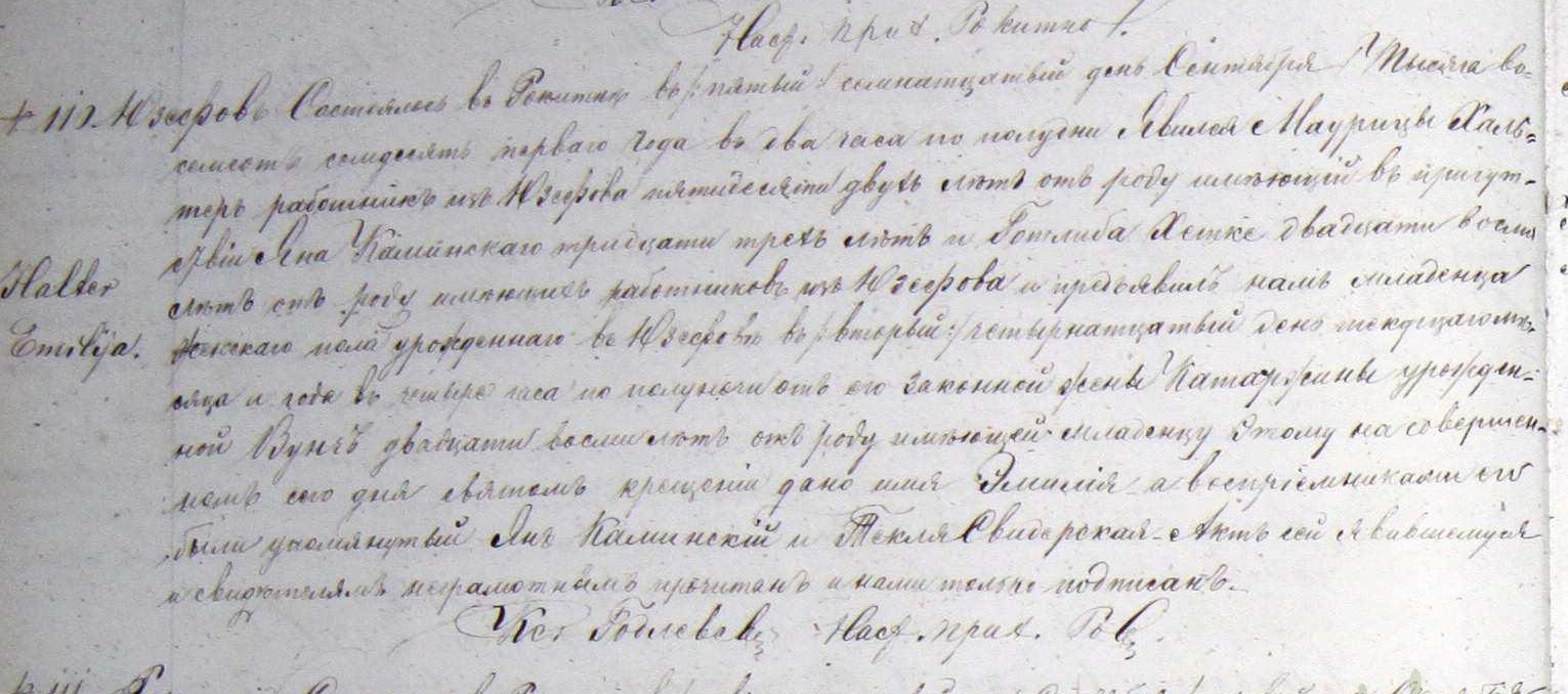 Jozefow Halter, Emilija Compiled in Rokitno on 5/17 September, 1871, at 2:00 PM. Appeared Marcin Halter, laborer from Jozefow, 52, in the presence of Jan Kaminski, 33, and Gottlieb Hetke, 28, workers from Jozefow, and presented us with a female infant, declaring that she was born in Jozefow on 2/14 of this month and year at 4:00 PM of his legal wife Katarzyna nee Wuncz, 28. At the rite of Holy Baptism concluded today, the child was given the name of EMILIJA. Godparents were Jan Kaminski and Tekla Swidarski. This act read aloud to the illiterate declarant and witnesses and signed only by me. Fr. Godlewski, rector and registrar.