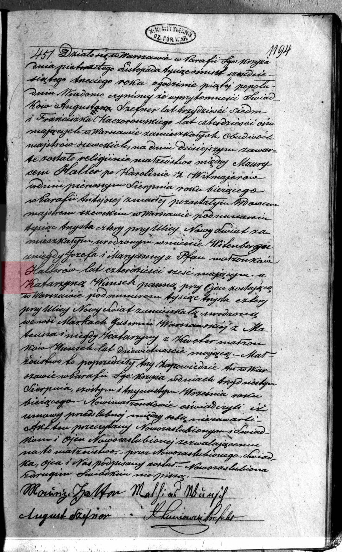 It did happen in the parish of the Holy Cross - Swietego Krzyza- on the fifteenth day of November, year one thousand eight hundred and sixty-three, at five o'clock in the afternoon. We make it known, that in the consciousness of witnesses August Szefner, thirty- seven years old, and Franciszek Kaczorowski ,forty- eight years old, residing in Warsaw, both masters shoemaker, today has been concluded religious marriage between Maurycy Halter, widow of Karolina born Witmajer, deceased on the first day of August of the current year in the local parish, master shoemaker , residing in Warsaw, under the number one thousand three hundred and four, Nowy Swiat street, born in the city of Wittenberg, son of the late Jozef and Maryanna born Pfau, spouses Halter, forty- six years old, and Katarzyna Wunsch, young woman staying with her father, residing in Warsaw, under the number one thousand three hundred and four , Nowy Swiat street, born in the village of Marki, province of Warsaw, daughter of Mateusz and the late Katarzyna born Kweter, spouses Wunsch, nineteen years old. This marriage was preceded by three announcements, here in Warsaw in the parish of the Holy Cross, on thirty of August, sixth and thirteenth of September of the current year. New spouses declared they did not sign a prenuptial agreement between themselves. This act was read to the newlywed and witnesses and to the father of the newlywed (bride) giving permission to this marriage, then it was signed by the newlywed (groom), one witness, the father and us. The newlywed (bride) and the second witness do not write.